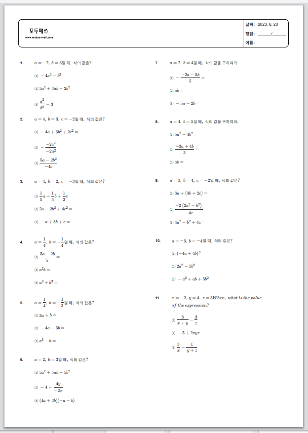중1 수학 > 문자의 사용 > 수의 값 구하기 연습문제 프린트 학습지