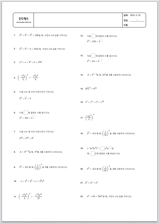 | 중2 수학 > 단항식의 계산 > 지수법칙 연습문제 프린트 학습지 (0) | 2023.06.20 |