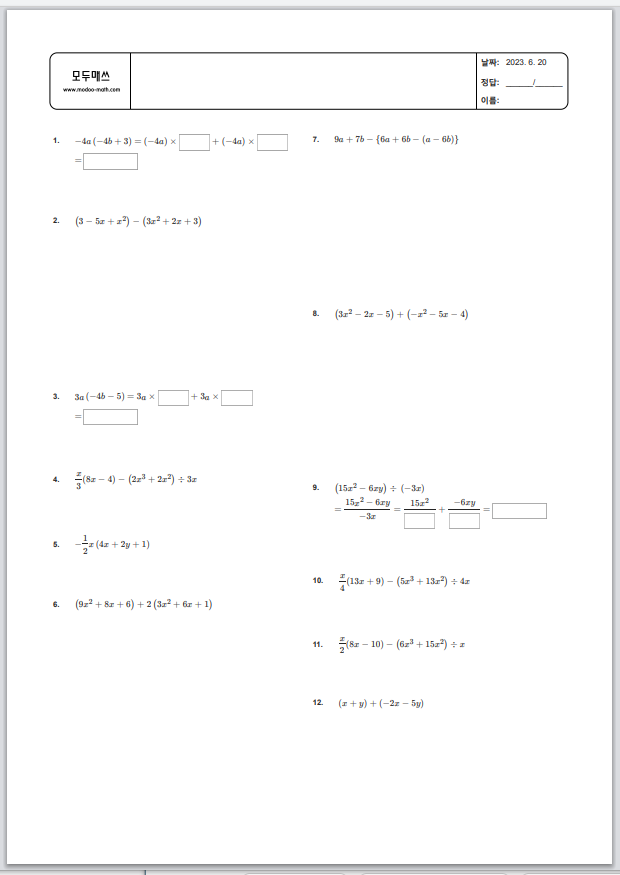 | 중2 수학 > 다항식의 계산 > 다항식의 계산 연습문제 프린트 학습지 (0) | 2023.06.20 |