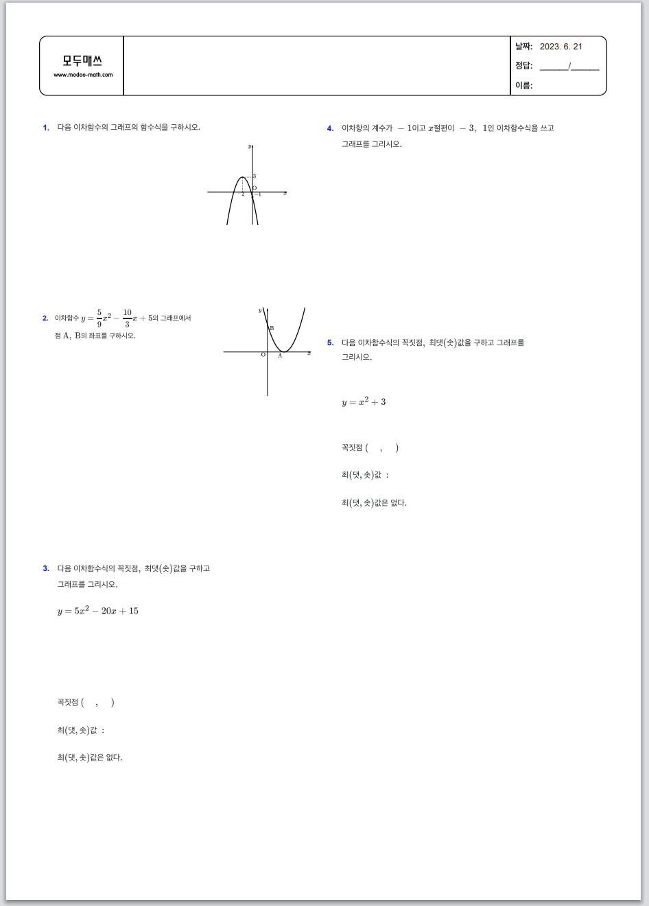 고등 수학(상) > 이차함수 > 이차함수의 그래프 연습문제 프린트 학습지