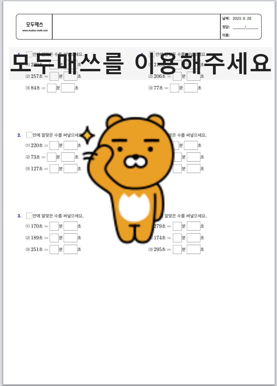 | 초등 3학년 수학 > 시간 > 분을 초로 바꾸기 연습문제 프린트 학습지 (0) | 2023.06.28 |