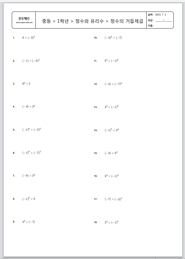 위의 문제들은 정수의 거듭제곱을 계산하는 문제입니다. 거듭제곱은 해당 수를 여러 번 곱하는 것을 의미하며, 계산을 통해 정확한 답을 얻을 수 있습니다.