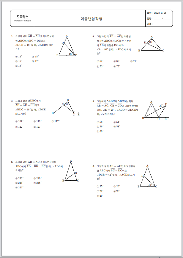 중2 수학 > 이등변삼각형 > 이등변삼각형 연습문제 프린트 학습지