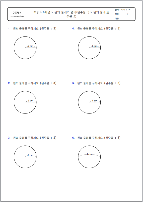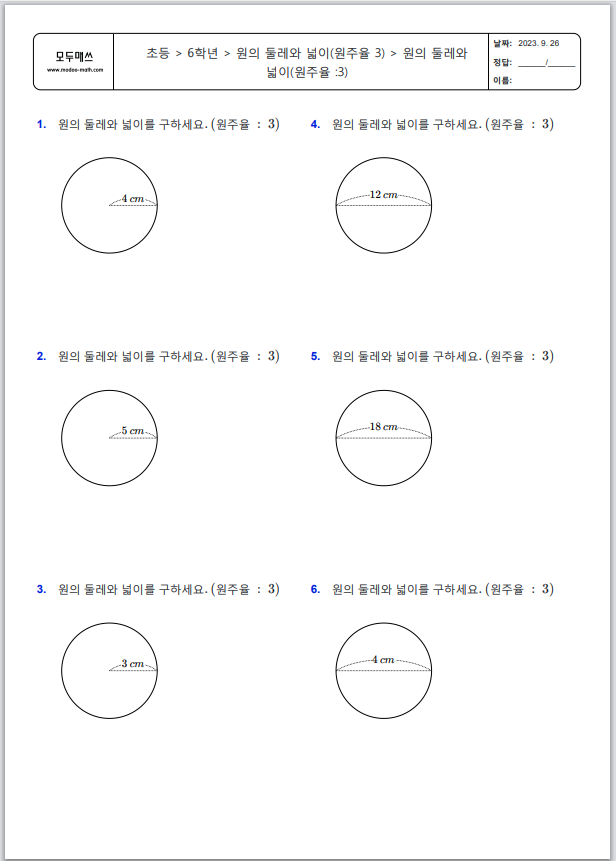초등 6학년 수학 > 원의 둘레와 넓이 > 원주율 3.1 프린트 학습지 (0) | 2023.09.26 |