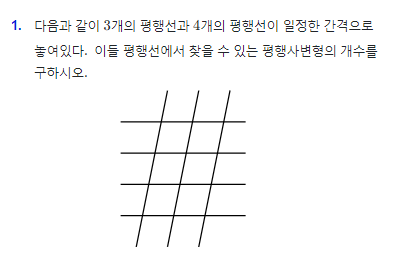 평행사변형의 개수를 구하는 문제입니다. 이 문제는 가로선 4개 중 임의로 2개를 선택하고, 세로선 3개 중 임의로 2개를 선택하는 경우의 수와 같아요. 다음 그림을 보시면,
