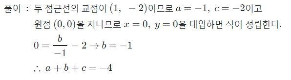 유리함수의 그래프를 보고 유리함수식의 미지수를 구하는 문제입니다.