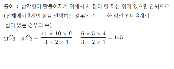 위 그림을 보시면 6개의 점이 한 직선 위에 놓여있는걸 알 수 있어요. 6개의 점에서 3개를 선택하는 경우의 수를 전체 경우의 수에서 빼주어야 한답니다.