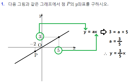 이 문제는 정비례 관계식을 구하고, 그 식을 이용하여 점 P의 y좌표를 구하는 문제입니다.