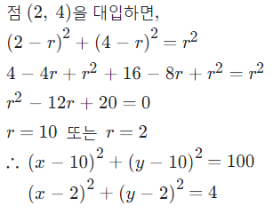 이 원의 방정식이 그래프로 그려졌을 때, (4,2)를 지나게 됩니다.(달리 말하면 (4,2)라는 점이 원 위에 있습니다.)