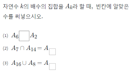 (1)번 문제를 보시면 A6은 6의 배수의 집합, A2는 2의 배수의 집합이죠.