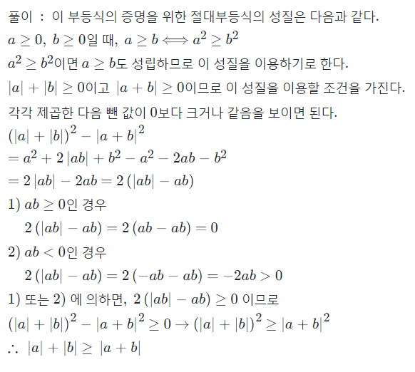 항상 내신시험에 빠지지 않고 등장하는 문제죠. 절대부등식을 증명하는 문제인데요, 이 문제를 꼼꼼하게 설명하는 해설이 많지 않아서 아주 상세히 다루도록 하겠습니다.