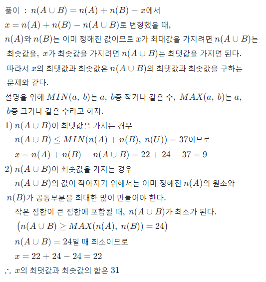 이 문제에서는 집합 A의 원소의 개수가 22, 집합 B의 원소의 개수가 24이므로 최대한 교집합을 늘려가다보면 결국 집합 A가 집합 B의 부분집합이 되는 경우의 그림을 생각할 수 있어요. 바로 이때가 교집합이 최대가 되는 때랍니다. 집합 A와 집합 B의 합집합을 바라보면 이때가 합집합이 가장 작을 때라는 것도 아시길 바래요.