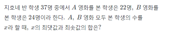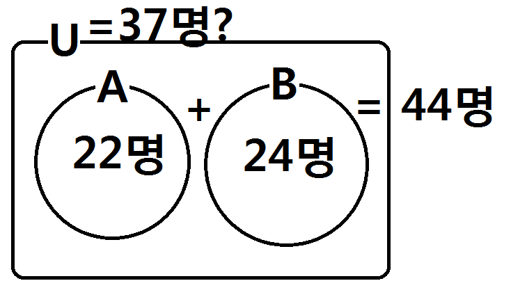 특히 이 문제에서는 전체 학생 수가 37명이고 A영화를 본 학생이 22명, B영화를 본 학생이 24명이기 때문에 만약 위 그림과 같다면 모순이 발생하죠.