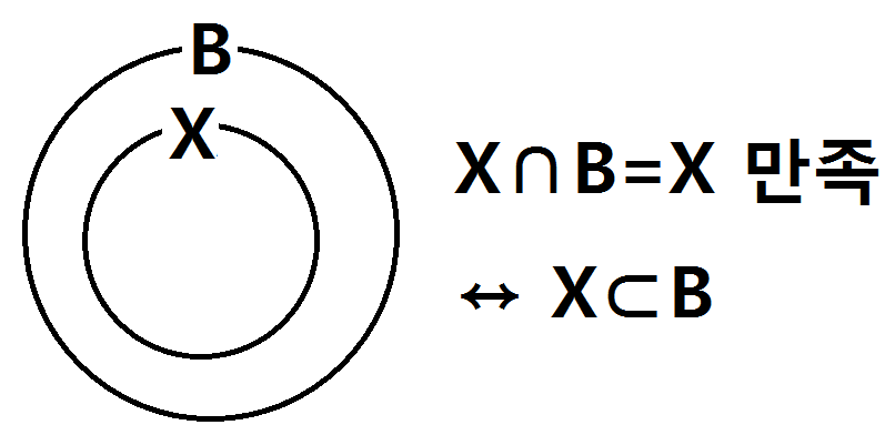다음으로 X∩B=X를 만족하는 포함관계가 있는 벤다이어그램으로 나타내보면,