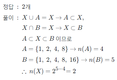 X⊂B 임을 알 수 있어요. 이를 종합해보면, A⊂X⊂B 이므로 집합X는 집합A의 모든 원소를 가지고 있으면서 집합B의 부분집합인 것이죠. 그럼 집합A의 원소의 개수와 집합B의 원소의 개수를 알면 집합X가 가능한 경우를 알 수 있겠습니다.
