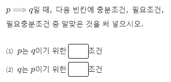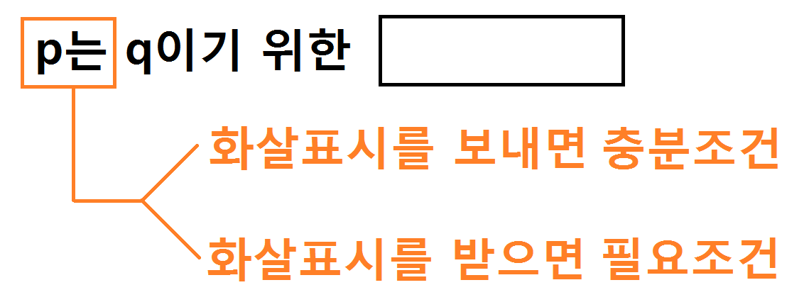 p는 q이기 위한에서 p가 화살을 보내면 '충분조건' 화살을 받으면 '필요조건'이에요.