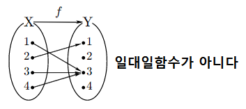 일대일 함수는 다음 그림과 같이 서로 다른 원소에 대응되어야 하는거에요.