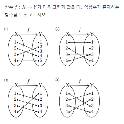 (4)는 일대일함수를 만족하고, 치역과 공역이 같아요. 역함수가 존재해요(정답)