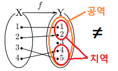 위 그림의 경우처럼 공역은 {1, 2, 3, 4, 5} 이고 치역은 {1, 2, 4, 5} 이므로 치역≠공역이지만 일대일함수는 맞습니다.