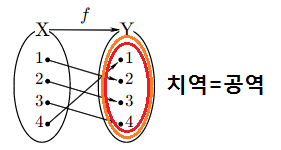 치역과 공역이 다르다는 걸 알 수 있어요. 그럼 치역과 공역이 같은 그림은 뭘까요?