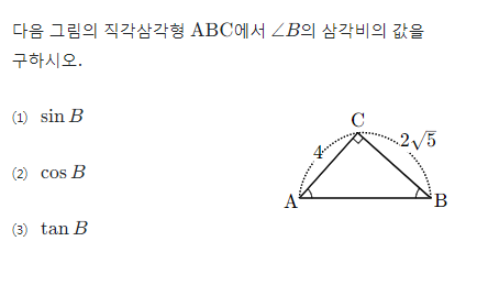 직각삼각형의 한 변의 길이를 모를 때, 피타고라스의 정리로 변의 길이를 구한 다음, 삼각비의 값을 구하는 문제입니다.