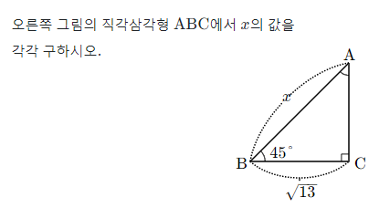 이 문제를 보면, 직각삼각형이 45도의 특수각을 가졌는데요, 1 : 1 : 루트2 의 비를 가진다는 걸 이용하면, x의 값은 2루트13이 됨을 알 수 있습니다.