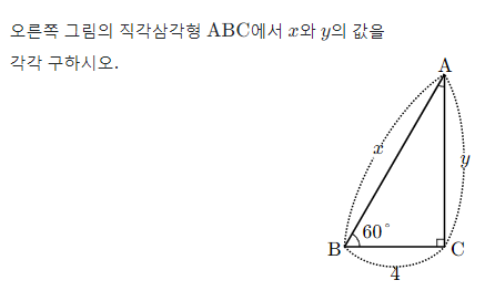 이 직각삼각형은 특수각이 60도인데요, 1 : 2 : 루트3 이라는 비를 가진 삼각형이라는 걸 알 수 있어요. 가장 짧은 변이 1, 다음으로 긴 변이 루트3, 가장 긴 변이 2의 비를 가지므로 x의 값은 8이고, y의 값은 4루트3임을 알 수 있어요.