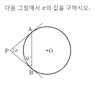 원 밖의 한 점에서 그은 두 접선이 원과 만나는 점을 A, B라고 할 때, 선분 PA와 선분 PB의 길이는 같으므로 삼각형 APB는 이등변삼각형이라는걸 알 수 있어요. 따라서 각 PAB도 50˚이므로 각P의 크기는 180-50-50=80도 임을 알 수 있습니다.