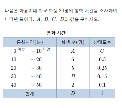 상대도수는 그 계급의 도수를 도수의 총합으로 나눈 값이예요. 상대도수의 합은 항상 1이므로 미지수 C의 값을 구할 수 있어요.