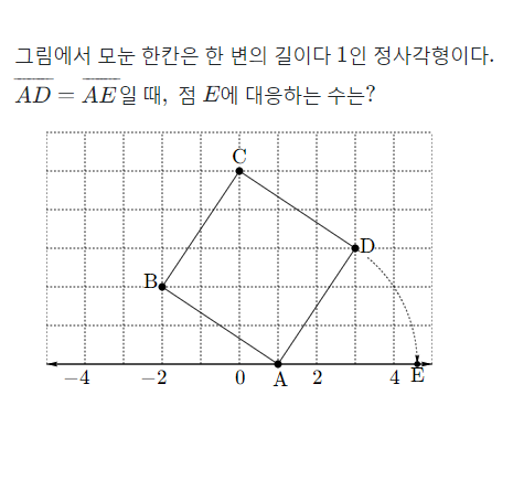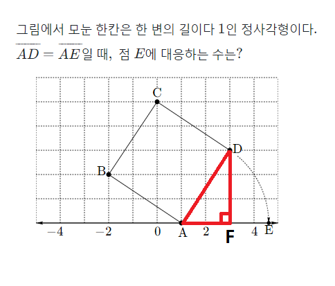 이 문제는 점E에 대응하는 수를 구하는 문제입니다. 점A를 출발점으로 삼고 선분AD의 길이만큼 더해주면 점E에 대응하는 수를 알 수 있습니다. 그럼 선분AD의 길이는 어떻게 구할까요?