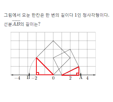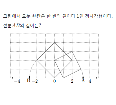 모눈 위의 정사각형 2개가 있는 문제입니다. 제곱근의 값을 각각 구한 다음 점에 대응하는 수를 찾고, 두 점의 길이를 구하면 됩니다.