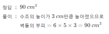 부피 개념을 잘 이해할 수 있는 직육면체 모양의 수조 문제입니다. 수조에 벽돌을 넣으면 부피가 늘어나므로 물의 높이가 올라가는데요, 얼만큼 물이 높아졌는지를 알면 수조에 넣은 벽돌의 부피를 알 수 있어요.