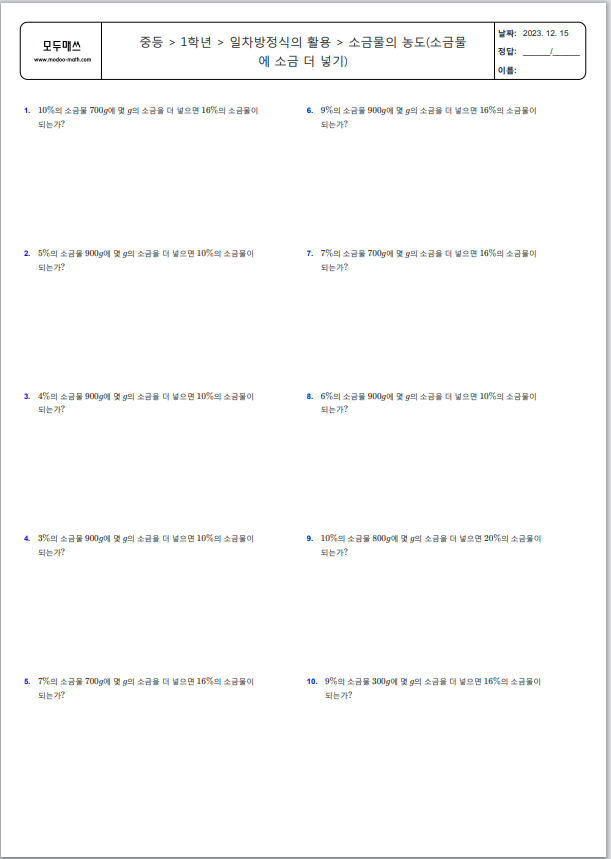 소금물 문제 유형은 크게 '소금 더 넣기', '소금물 증발시키기', '농도가 다른 소금물 섞기'가 있는데요, 3가지 유형 모두 있고, 유형들을 3개 모두 담아서 한 페이지에 넣을 수도 있어요.