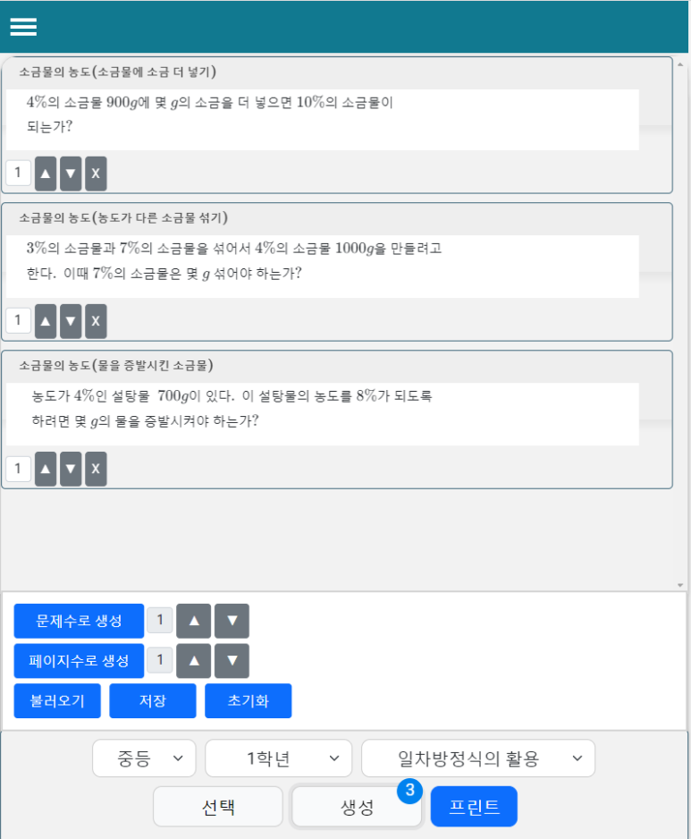 이제 중학교 문제도 만들어볼까요? 중학생 아이들이 가장 어려워하는게 바로 소금물 문제와 함수 문제예요.