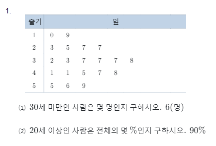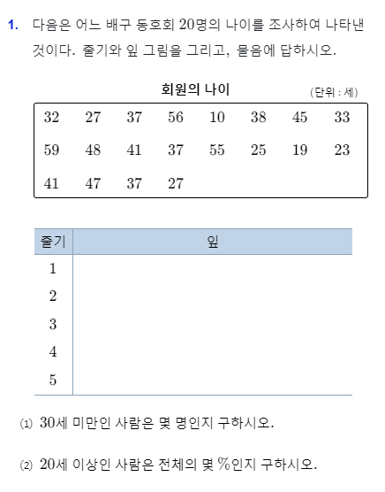 문제 하나를 풀어보도록 할게요. 회원 20명의 자료가 있구요, 줄기와 잎이라는 표가 있어요. 줄기는 십의 자리를 가리키고, 잎은 일의 자리를 가리킨답니다. 회원의 나이중 32가 있다면 줄기는 3, 잎은 2이므로 줄기 3 옆에 잎을 2라고 적으면 되는거에요.