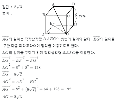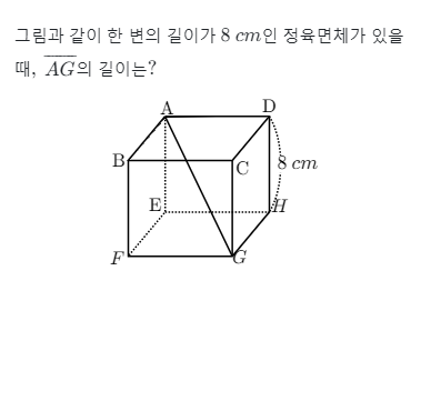 | 중등 3학년 > 피타고라스의 정리 > 직육면체에서 한 면의 대각선의 길이 구하기 프린트 학습지 (0) | 2024.01.19 |