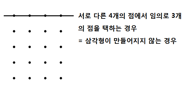 어떤 가상의 선이 있다고 할 때, 그 선 위에 있는 점 3개를 선택하여 연결하면 삼각형이 만들어지지 않아요. 그렇다면 이런 경우의 수를 어떻게 하면 효율적으로 찾을까요?