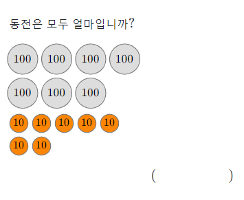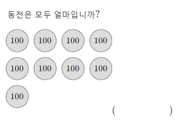 이 문제를 보면 100원짜리 동그란 모양이 몇 개가 있는지 세어보면 됩니다. 총 9개가 있으므로 100을 9번 더하면 900원이 된다는걸 알 수 있어요.