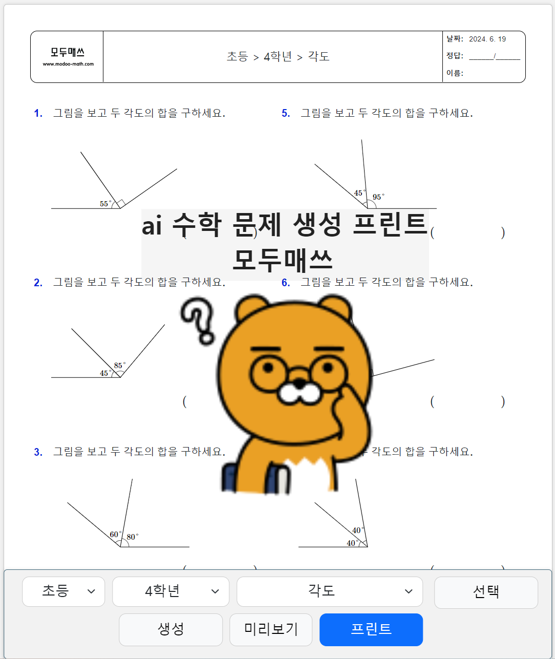 | 초등 4학년 수학 > 각도 > 두 각도의 크기의 차 구하기 연습문제 프린트 학습지 (0) | 2024.06.19 |