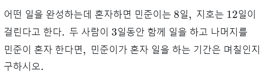 $\cdot$ 민준이가 혼자서 하루에 할 수 있는 일의 양 → $\dfrac{1}{8}$