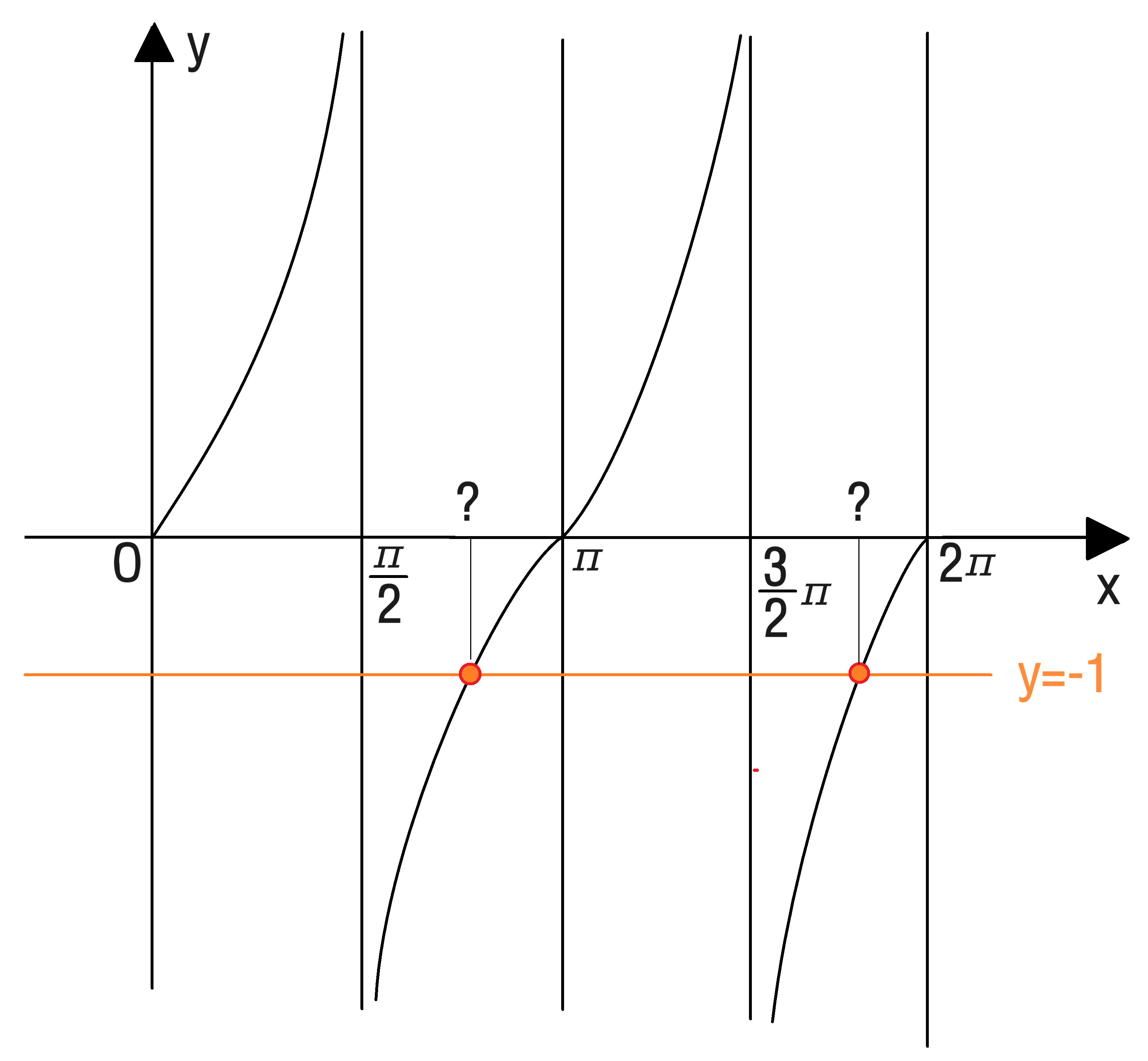 $y=1$의 보조선을 그었을 때의 교점을 ★, ◎이라 하면, ★의 값은 $tanx=1$이 되는 예각은 $\dfrac{\pi}{4}$라는 특수각임을 알 수 있고, ◎는 주기인 $\pi$를 한 번 더한 $\dfrac{5}{4}\pi$가 됨을 알 수 있습니다. 이때, 원점대칭을 이용하면 $(\pi,0)$ 점 대칭을 활용하여, 첫번째 ?의 값이 $\pi-\dfrac{\pi}{4}=\dfrac{3}{4}\pi$임을 알 수 있고, 두번째 ?의 값이 $2\pi-\dfrac{\pi}{4}=\dfrac{7}{4}\pi$임을 알 수 있습니다.