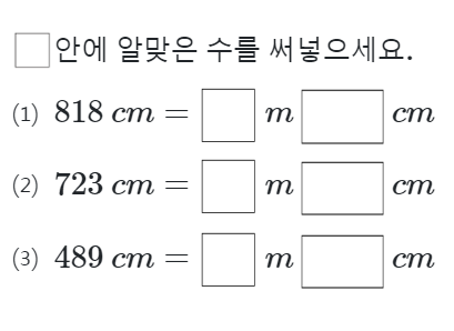이번 문제는 주어진 길이(cm)를 미터(m)와 센티미터(cm)로 변환하는 연습입니다. 각 문제를 풀면서, 100cm가 1m라는 개념을 활용해 보세요.
