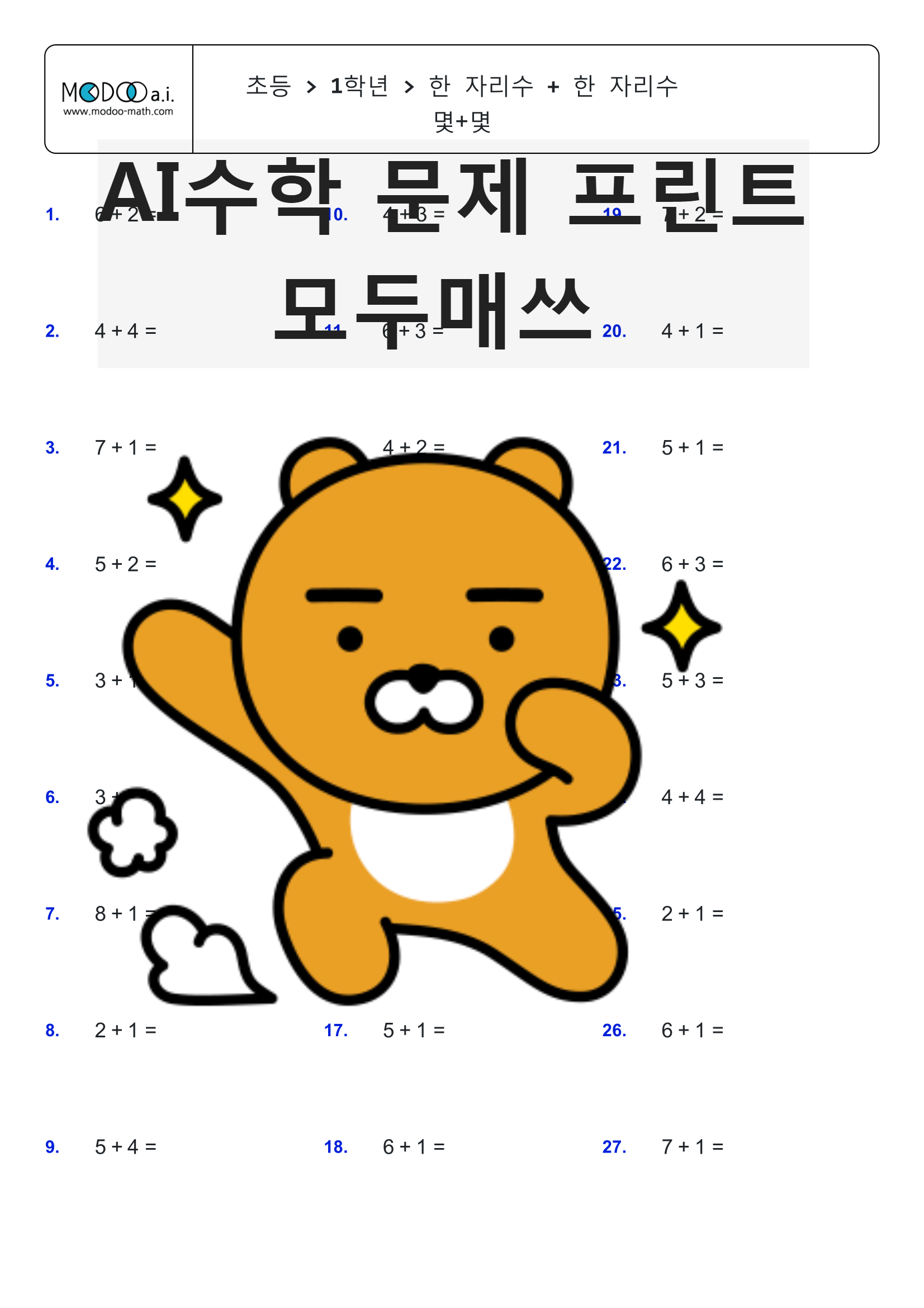 덧셈을 반복해서 연습을 하는 것이 좋아요. 모두매쓰 사이트에서 프린트해서 한 자리수 + 한 자리수 연습을 많이 할 수 있도록 하세요.