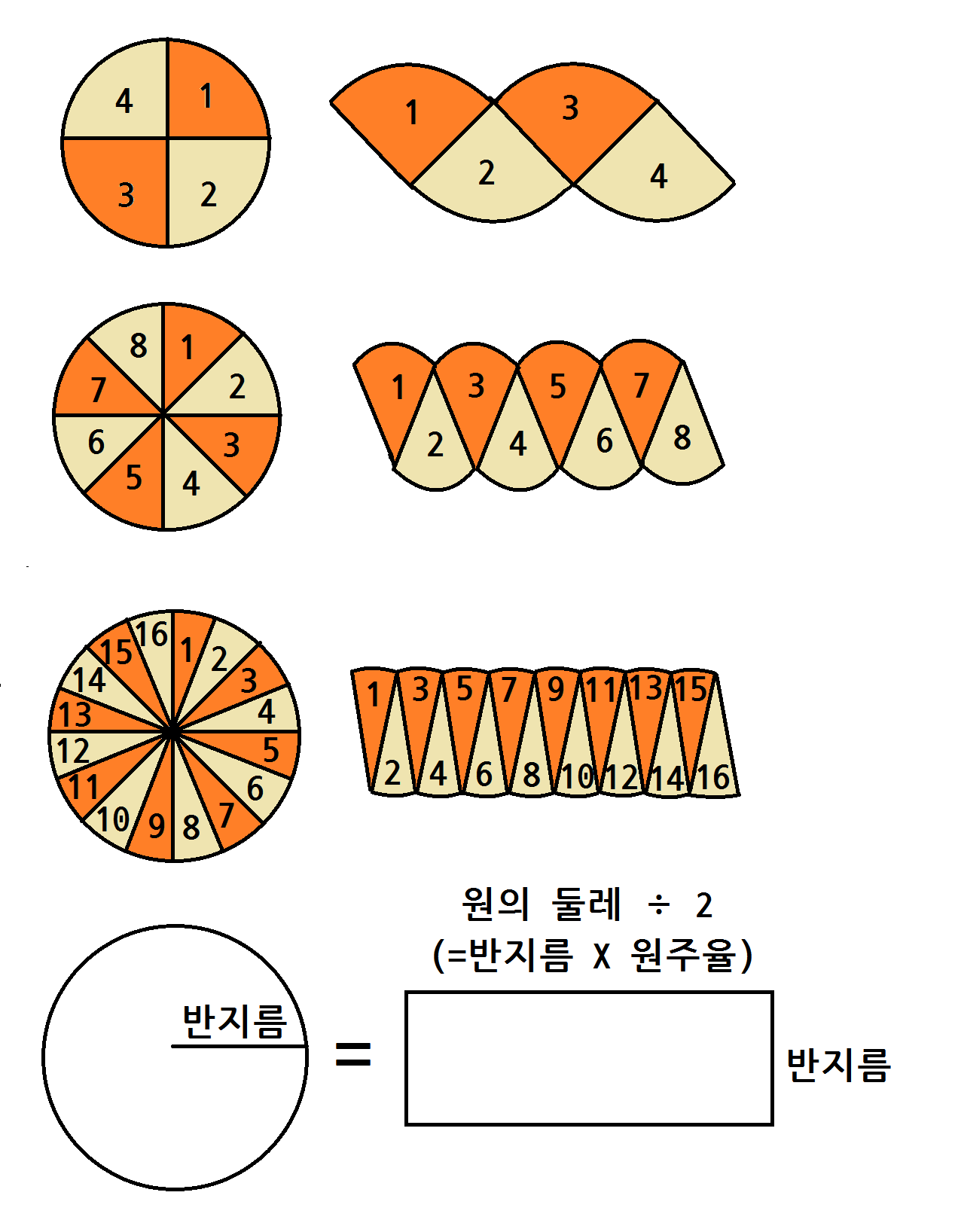 원을 조각조각을 낸 다음 번갈아가며 포개다보면 직사각형의 형태에 가까워진다는 것을 알 수 있어요.