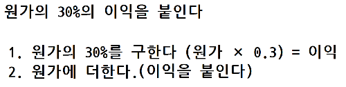 원가의 30%의 이익을 붙인다고 할 때 우선 원가의 30%가 얼마인지를 구하고 그걸 이익으로써 원가에 더하는걸 말해요.