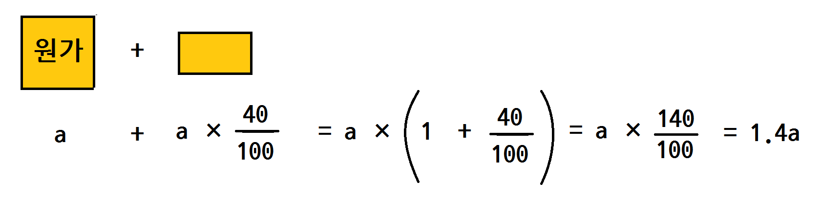 원가 a에 40%의 이익을 붙이면 1.4a가 되네요. 그럼 이 1.4a를 정가라고 부르는 거에요. 그런데 물건이 잘 팔리지 않아 100원을 할인했군요. 그럼 100원을 그냥 빼주면 돼요. 이걸 할인된 가격(줄여서 할인가)라고 해요.