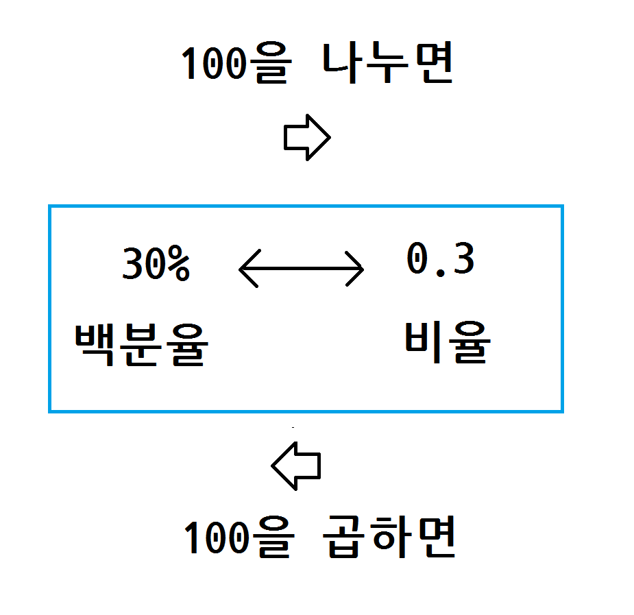 원가의 30%는 원가에 30%의 비율값을 곱하여 구하는데요, 30%는 백분율이고 비율은 0.3이에요.