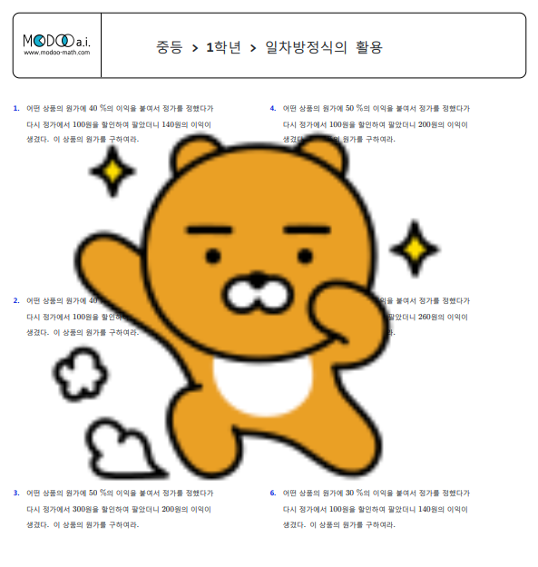 학생들에게 원가 정가가 특히 어렵게 느껴지는 이유는 용어 자체에 대한 개념이 학생들의 실생활하고는 거리가 있기 때문인데요. 그도 그럴 것이 물건을 만들거나 이익을 붙여서 팔거나 팔리지 않아서 할인하거나 해본 경험이 거의 없기 때문이죠. 그래서 먼저 용어에 대한 개념을 이해 시키는게 필요해요. 특히 비율이나 백분율에 대한 개념도 함께 이해가 되어야 이 문제를 자연스럽게 익힐 수 있습니다.