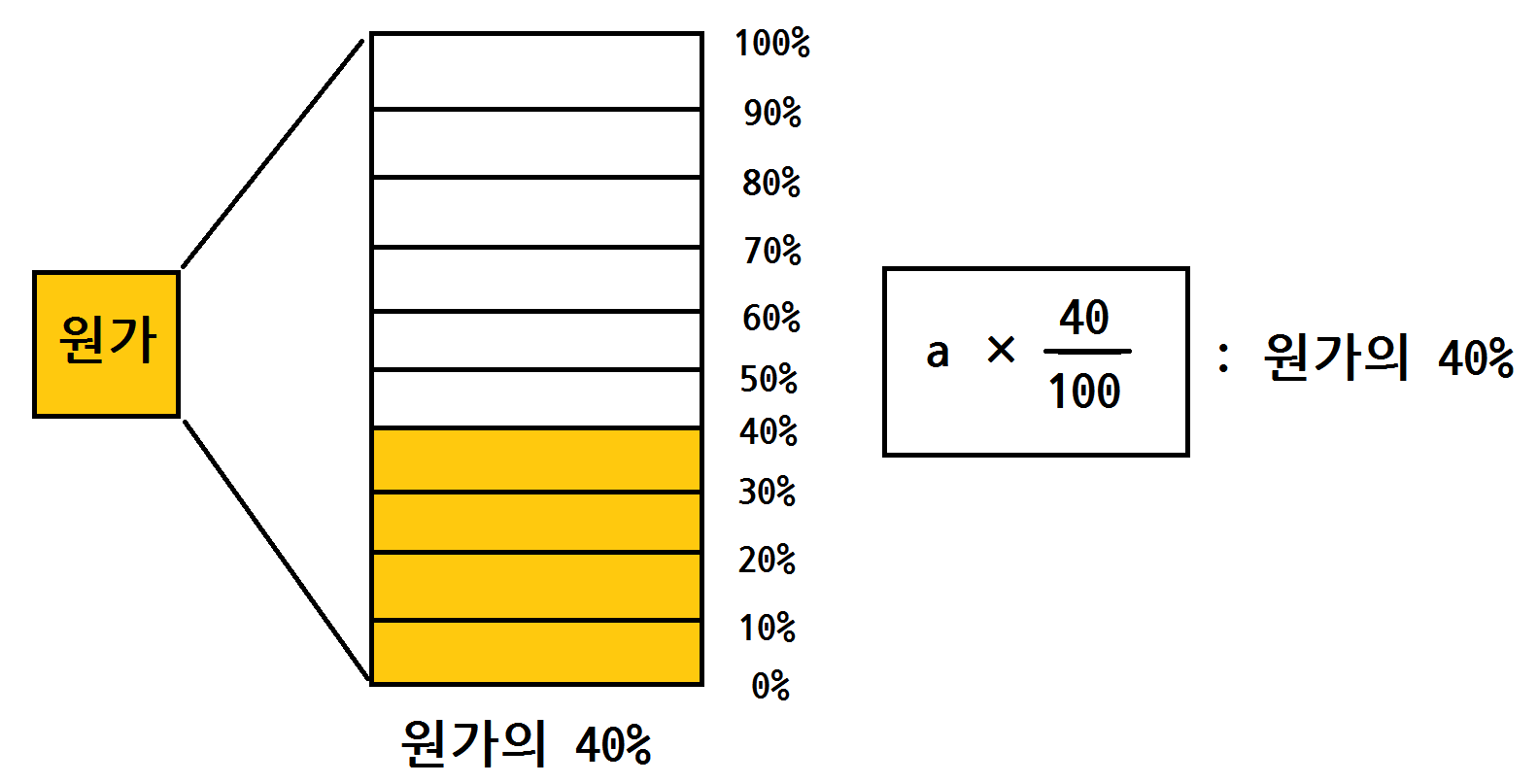 백분율의 값에 100을 나누어 비율로 만든 다음에 원가에 곱해줘야해요.