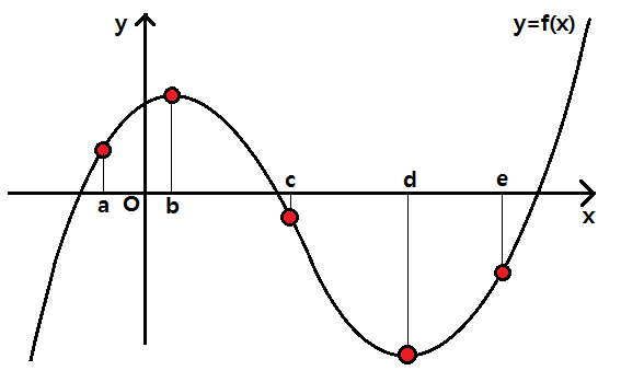 도함수 f'(x)의 x에 a, b, c, d, e를 대입할 때 각각의 값은 바로 위의 함수의 그래프 위의 점에서 접선을 그었을 때 그 접선의 기울기값과 같아요.